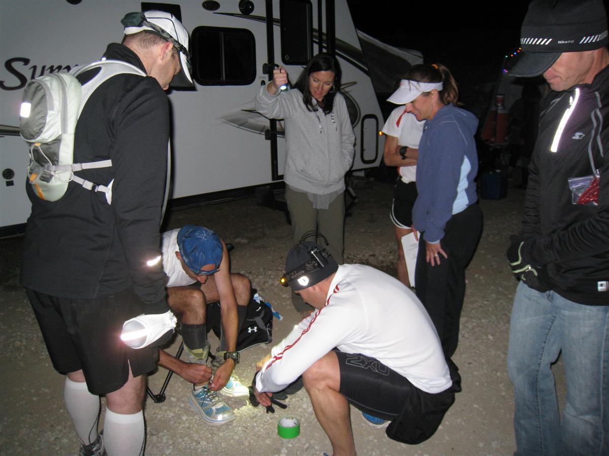 I don’t remember what I was doing, but I remember out of the darkness seeing Cam (my pastor) and Ken - I really wasn’t expecting that. Ken had told me he wanted to come down for the race, but he had too much family stuff going on, so I really wasn’t expecting him. I think I was so nervous for the start and surprised to see them I’m not sure they understood how much I appreciated them being there. Time for the start was quickly approaching. Cam said a quick prayer and handed me a "LET GO & LET GOD" wristband to wear. I finished getting ready just in time to take a couple pictures and get to the starting line.