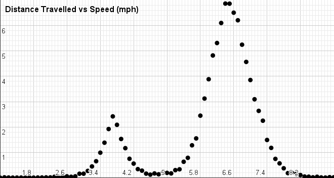 From the above graph you can see that there is a pretty good gap between what I would call walking and running. I figured anything slower than 4.8 mph which is a 12:30 minute/mile was walking. Based on that I walked approximately 16 miles of the 100. The peak of the walking pace is at 3.7 mph (16:12 min/mile), the peak of running was at 6.4 mph (9:22 min/mile)
